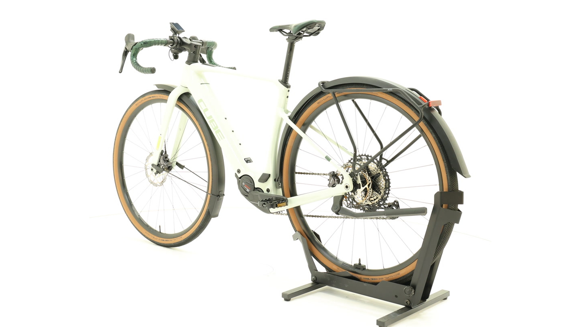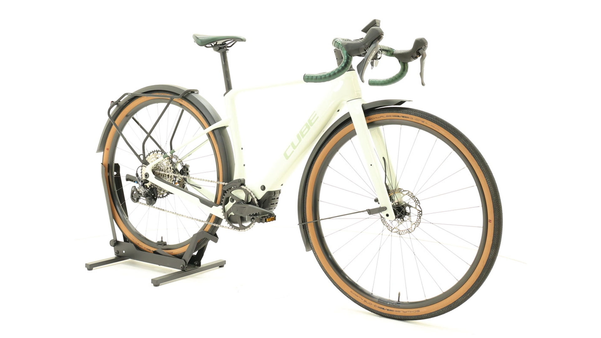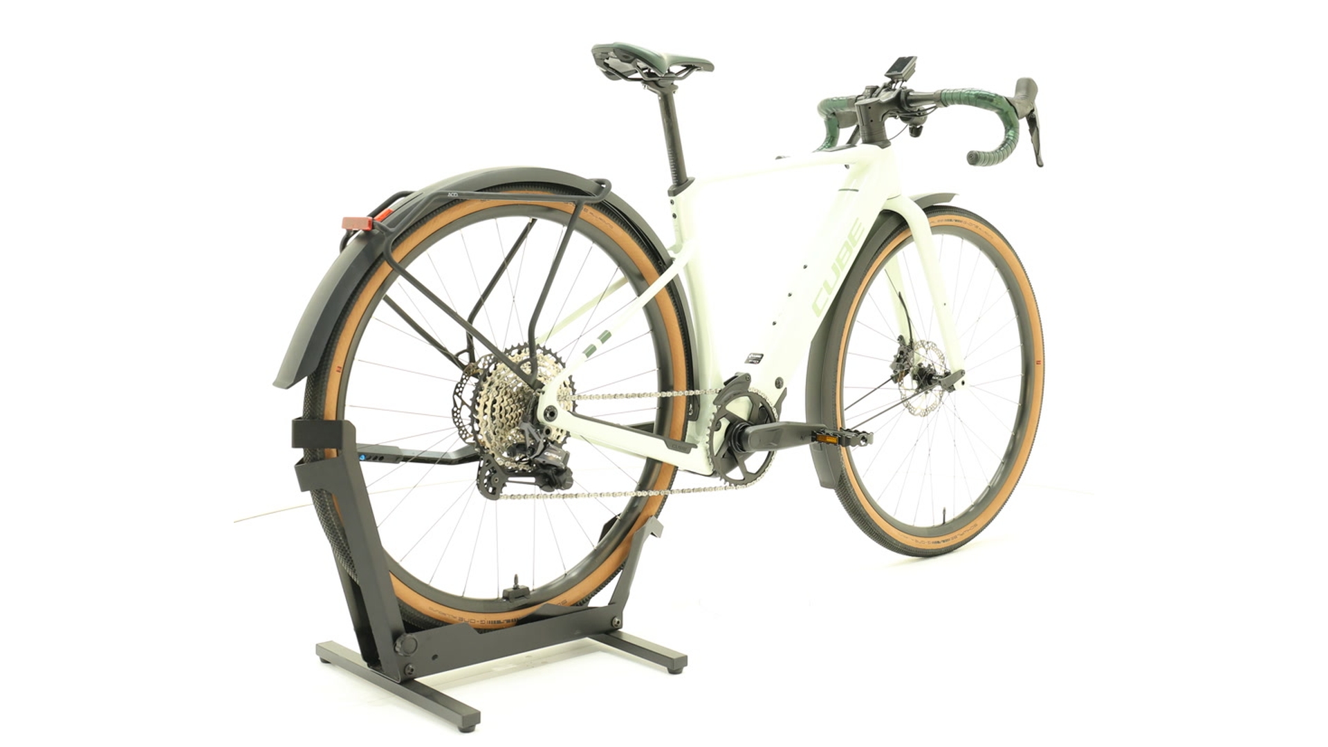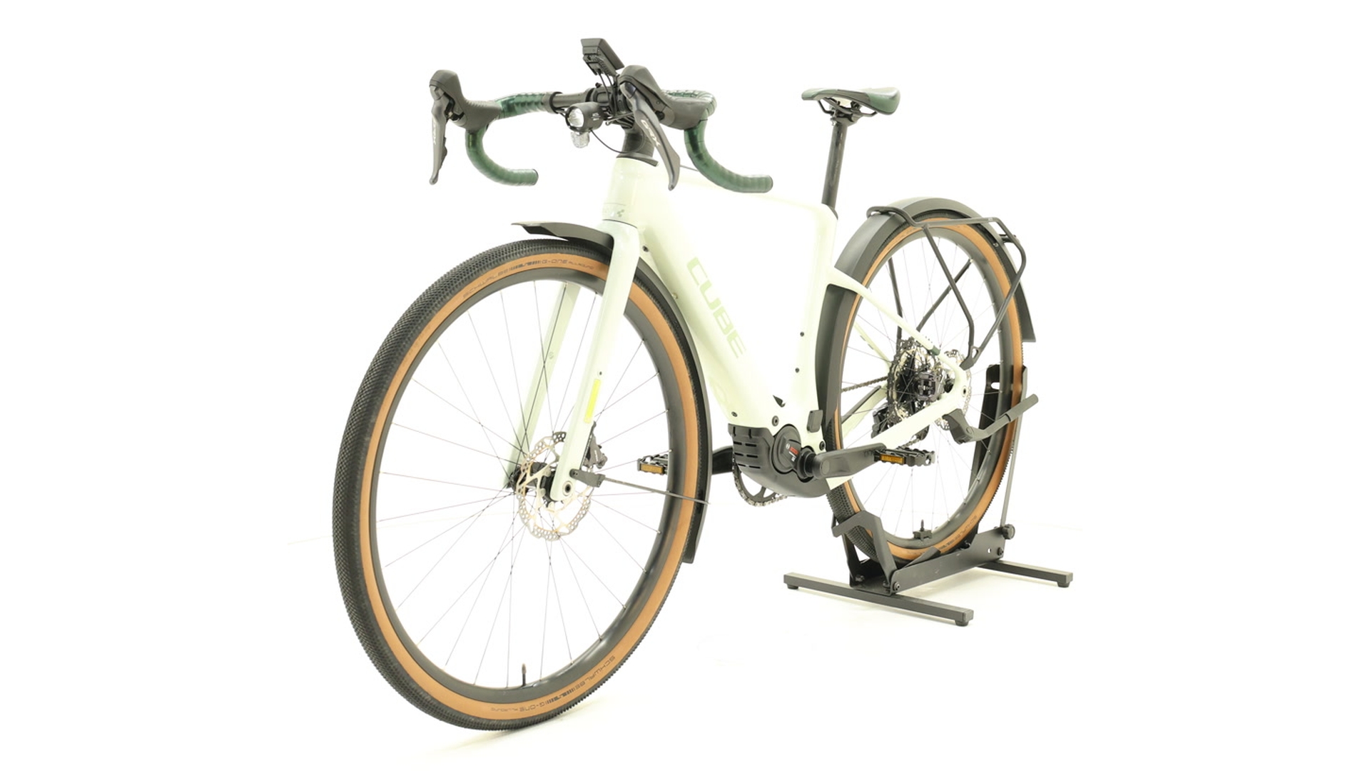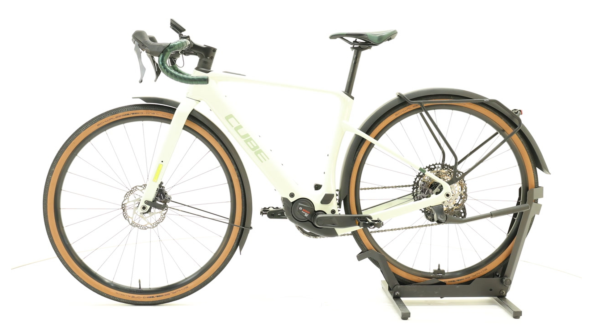 Cube Nuroad Hybrid C:62 Race FE 400X – This high-quality e-gravel bike combines sportiness and everyday practicality. The lightweight C:62 carbon frame with gravel endurance geometry ensures comfortable, agile handling. The compact Bosch Performance SX motor with 400 Wh battery provides powerful assistance (up to 55 Nm), which can be optionally extended with a "PowerMore" battery for longer tours. A 12-speed Shimano GRX gear system and hydraulic disc brakes ensure reliable shifting and braking performance, while robust Newmen wheels with Schwalbe tyres up to 50 mm wide provide grip even on unpaved roads. Fully equipped with mudguards, luggage rack, lights and stand – perfect for gravel touring, commuting or bikepacking.
